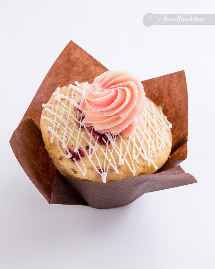 A mouth watering muffin, cooked to satisfy the discerning tastes of our foodbuddies. Enjoy this muffin with it's hidden raspberry jewels. A moist, sweet muffin cake holds those delicious berries within, waiting for you to count them as you eat. Don't forget the white chocolate on the top, will you save it for last.