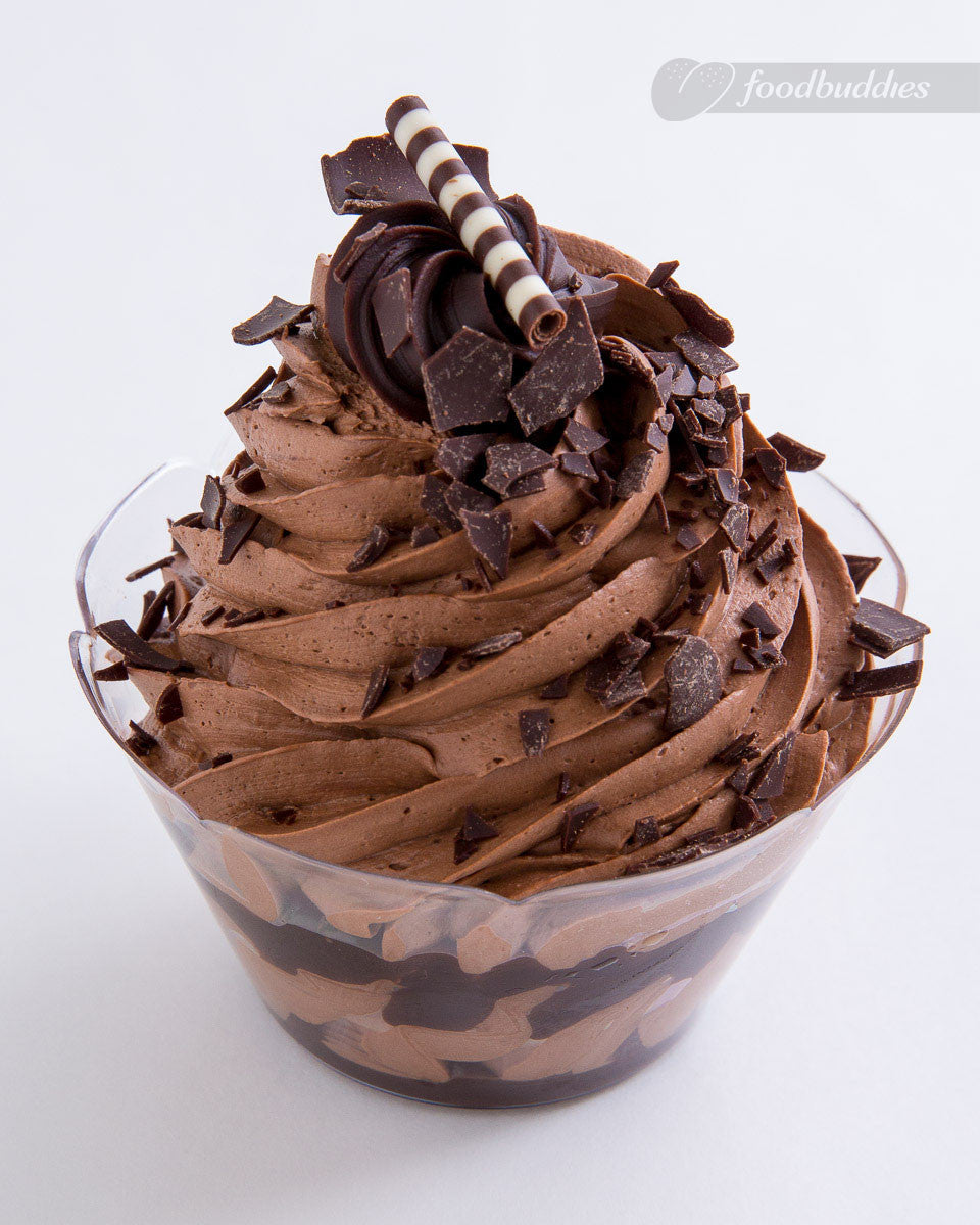 Meringue mousse with melted chocolate and cream. Finished with chocolate ganache rosette, sprinkled with chocolate shavings and topped with a duo mistro. Sold in a clear food cup.