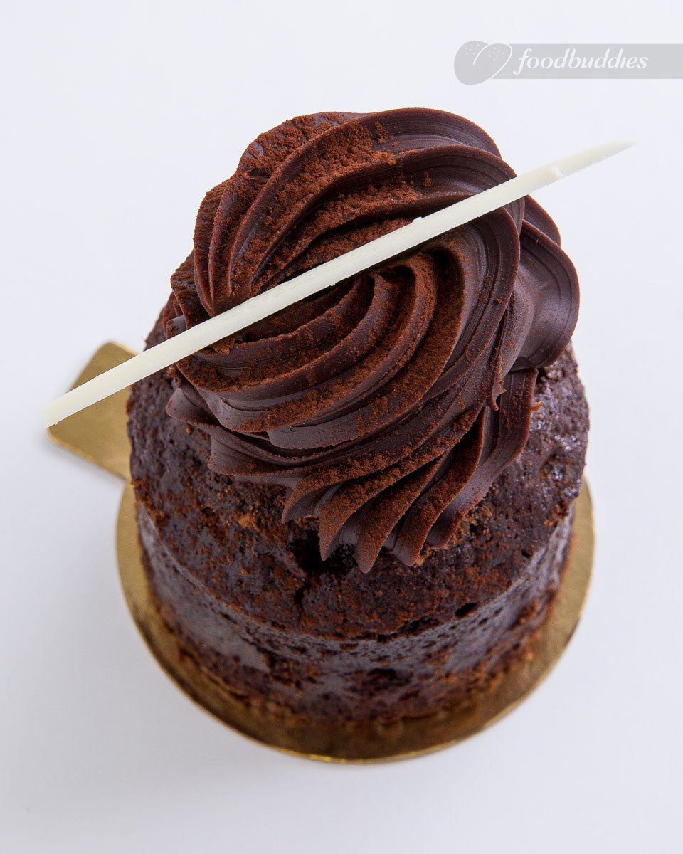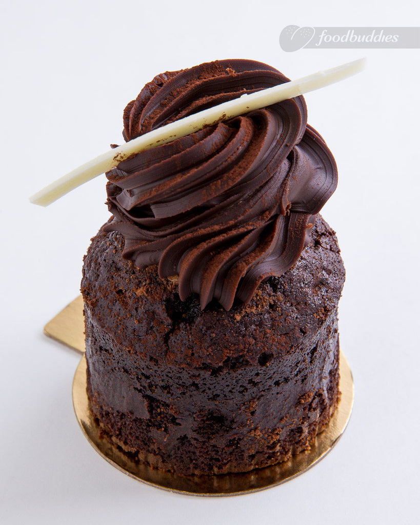 Soft chocolate cake filled with chocolate ganache. Topped with more chocolate ganache, a dusting of cocoa powder and finished with a white chocolate stick.