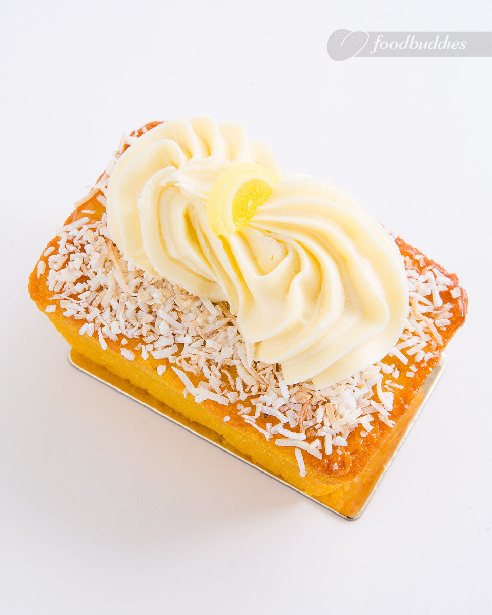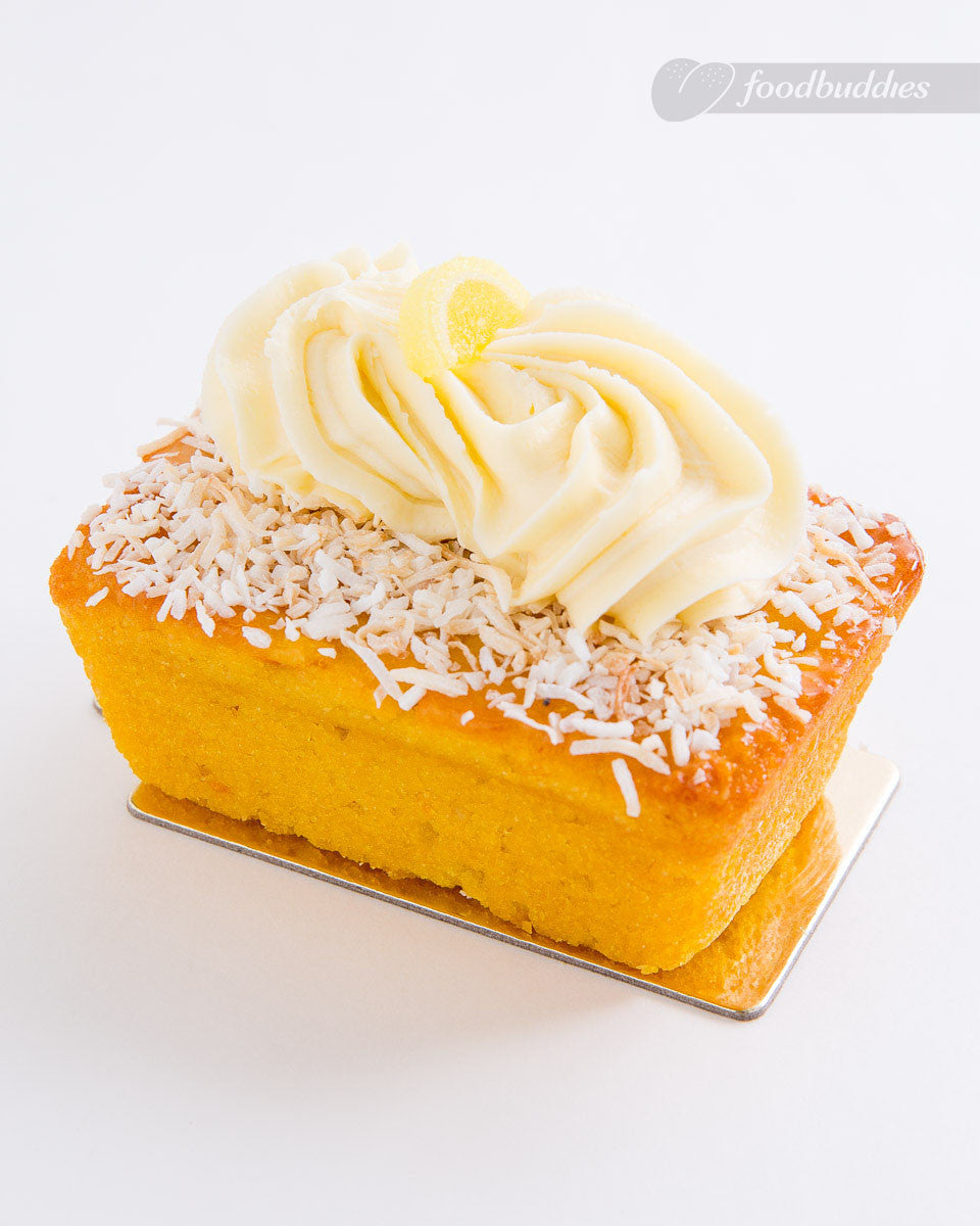 Lemon infused flourless cake, sprinkled with roasted coconut. Topped with cheese frosting rosette and a candied lemon.