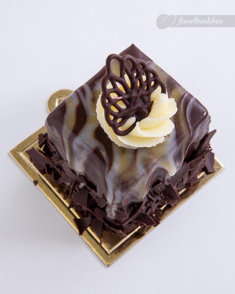 Layered moist chocolate cake with soft caramel sauce and chocolate mousse. Poured with melted chocolate, white ganache and caramel covering. Sprinkled with chocolate shavings and decorated with a chocolate crown.