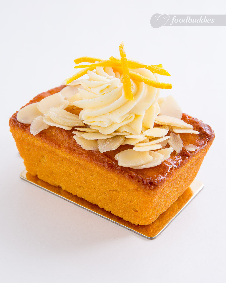 Orange flourless cake, topped with shaved almond pieces, dollop of cheese frosting and orange julienne.