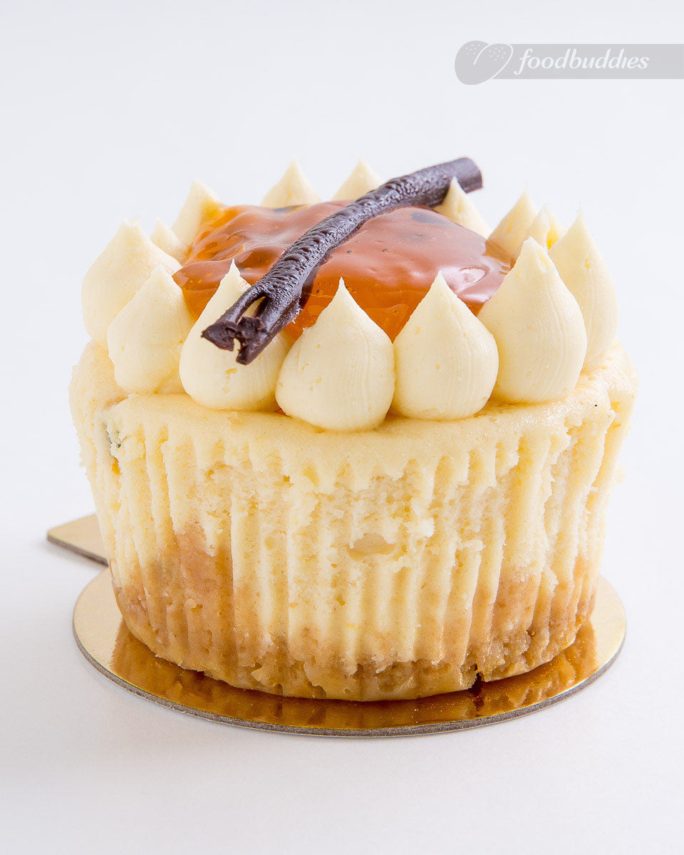 Baked passionfruit & white chocolate cheesecake on a crusty biscuit base. Piped with cheese frosting, filled with a passionfruit cools centre and topped with a chocolate stick.